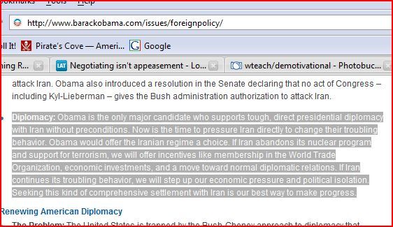 Diplomacy: Obama is the only major candidate who supports tough, direct presidential diplomacy with Iran without preconditions.Now is the time to pressure Iran directly to change their troubling behavior. Obama would offer the Iranian regime a choice. If Iran abandons its nuclear program and support for terrorism, we will offer incentives like membership in the World Trade Organization, economic investments, and a move toward normal diplomatic relations. If Iran continues its troubling behavior, we will step up our economic pressure andpolitical isolation. Seeking this kind of comprehensive settlement with Iran is our best way to make progress. (screenshot here before it ends up down the memory hole)